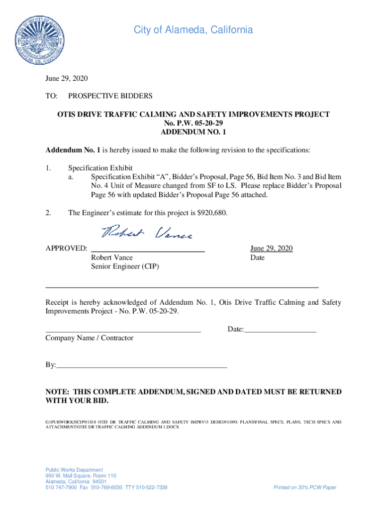 City of Alameda, California June 29, 2020, TO:PROSPECTIVE BIDDERSOTIS DRIVE TRAFFIC CALMING AND SAFETY IMPROVEMENTS PROJECT No. P.W. 052029 ADDENDUM NO. 1 Addendum No. 1 is hereby issued to make the