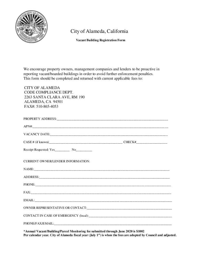 City of Alameda, California Vacant Building Registration Form encourage property owners, management companies and lenders to be proactive in reporting vacant/boarded buildings in order to avoid further