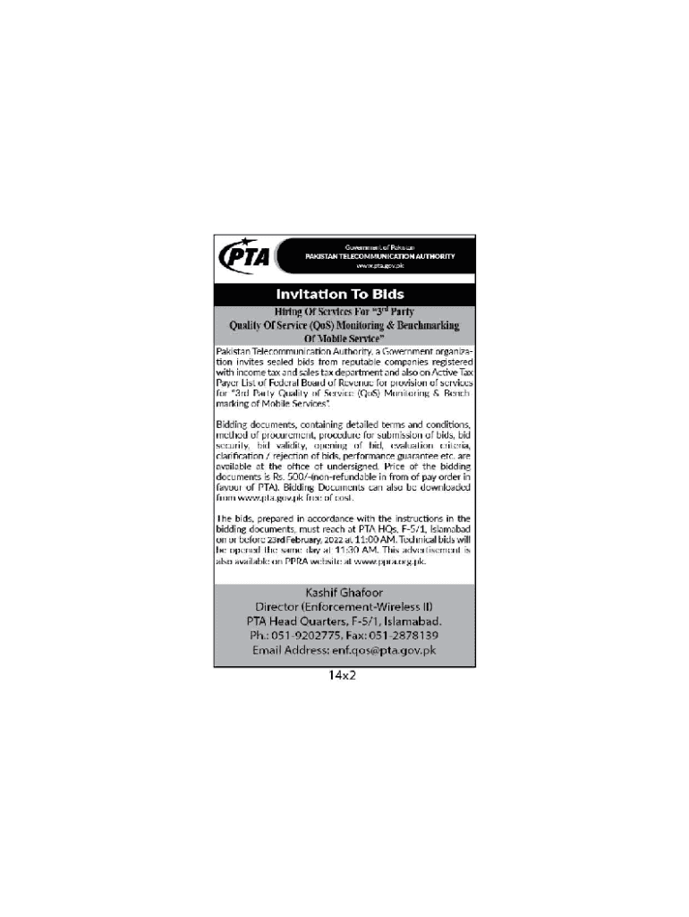 Pakistan Telecommunication AuthorityBIDDING DOCUMENT 3RDHIRING OF FIRMS FOR PROVISION OF PARTY QUALITY OF SERVICE MONITORING & BENCHMARKING OF CELLULAR MOBILE SERVICES Pakistan Telecommunication Authority,