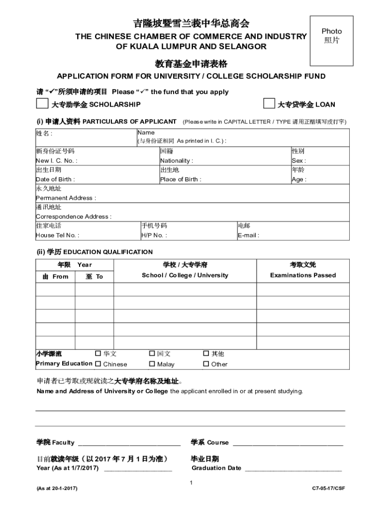 Photo THE CHINESE CHAMBER OF COMMERCE AND INDUSTRY OF KUALA LUMPUR AND SELANGOR APPLICATION FORM FOR UNIVERSITY / COLLEGE SCHOLARSHIP FUND Please the fund that you apply SCHOLARSHIP LOAN(i) PARTICULARS