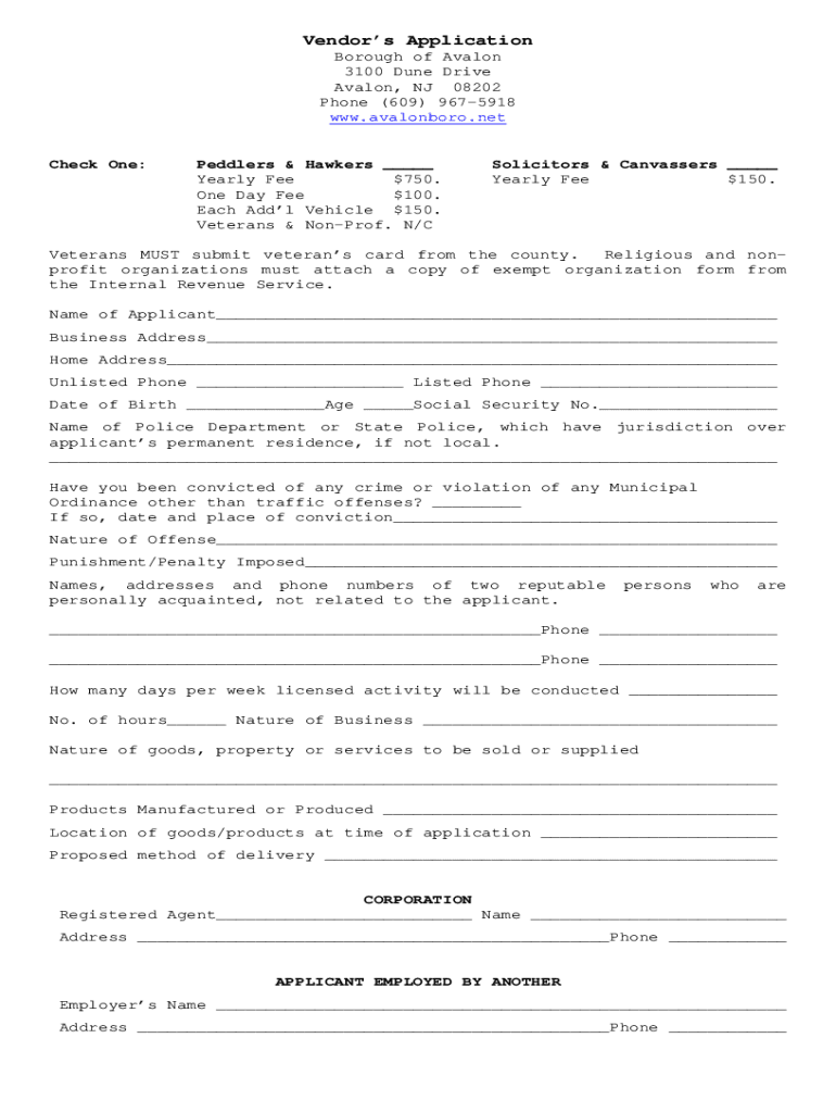 Vendors Application Borough of Avalon 3100 Dune Drive Avalon, NJ 08202 Phone (609) 9675918 www.avalonboro.netCheck One:Peddlers & Hawkers ___ Yearly Fee $750. One Day Fee $100. Each Add Vehicle $150.