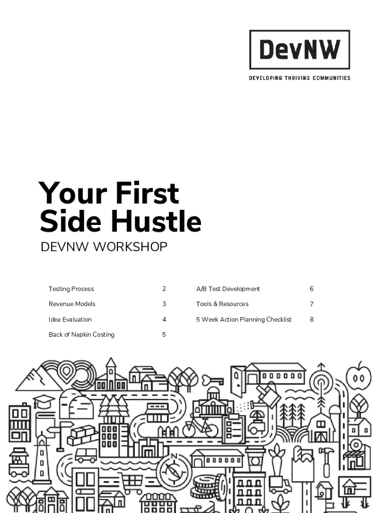 Your First Side Hustle DEAN WORKSHOP Testing Process2A/B Test Development6Revenue Models3Tools & Resources7Idea Evaluation45 Week Action Planning Checklist8Back of Napkin Costing51Side Hustle Testing