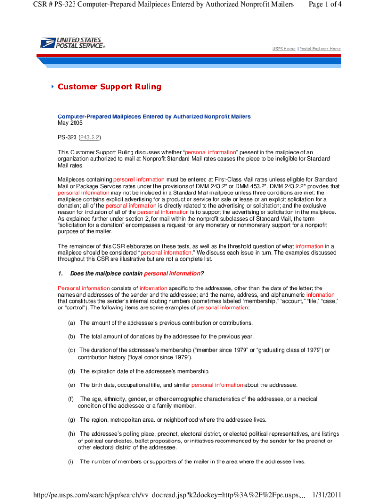 CSR # PS323 ComputerPrepared Tailpieces Entered by Authorized Nonprofit Mailers Page 1 of 4USPS Home | Postal Explorer HomeCustomer Support RulingComputerPrepared Tailpieces Entered by Authorized