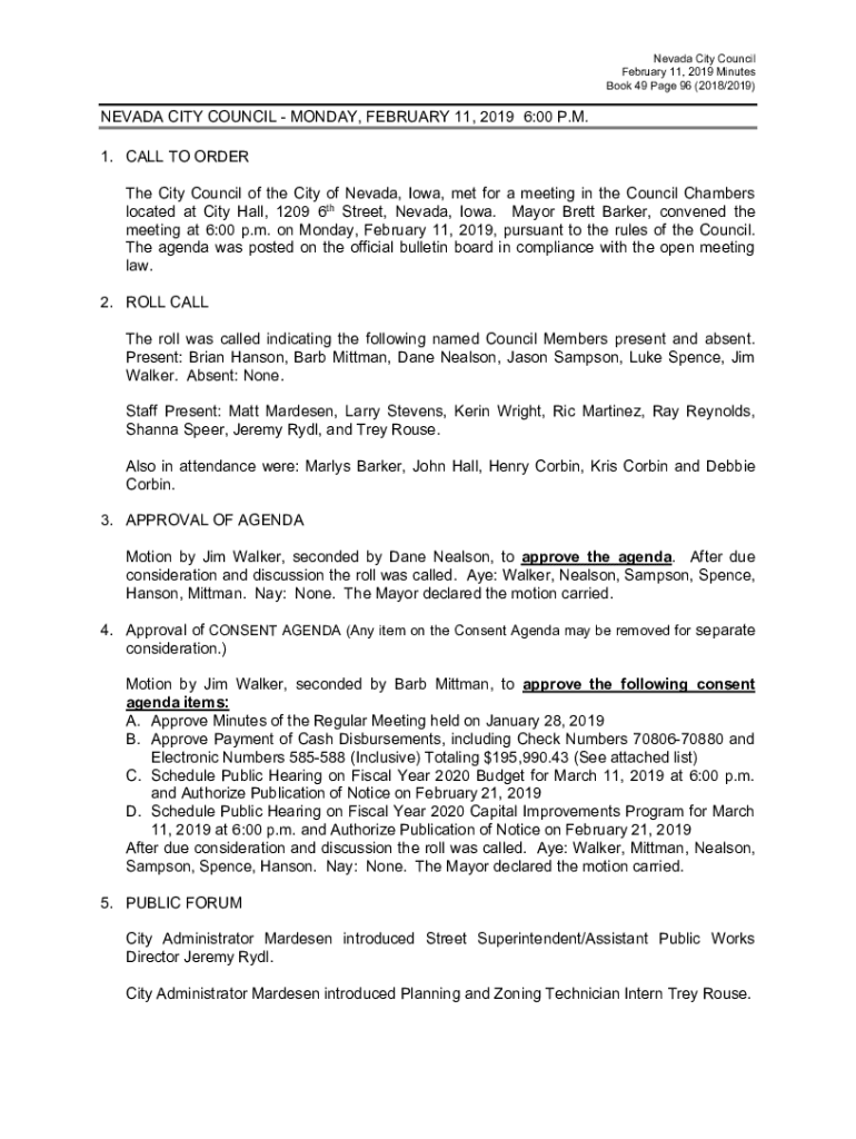 Nevada City Council February 11, 2019, Minutes Book 49-Page 96 (2018/2019)NEVADA CITY COUNCIL MONDAY, FEBRUARY 11, 2019 6:00 P.M. 1. CALL TO ORDER The City Council of the City of Nevada, Iowa, met
