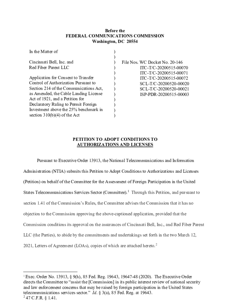 Before the FEDERAL COMMUNICATIONS COMMISSION Washington, DC 20554 In the Matter of Cincinnati Bell, Inc. and Red Fiber Parent LLC Application for Consent to Transfer Control of Authorization Pursuant