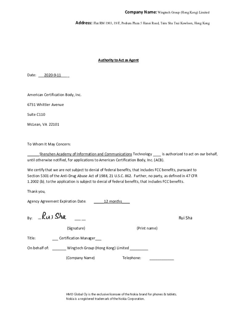 Company Name: Wing tech Group (Hong Kong) Limited Address: Flat/RM 1903, 19/F, Podium Plaza 5 Hanoi Road, Trim SHA Sui Kowloon, Hong KongAuthority to Act as Agent Date: ___2020911___American Certification