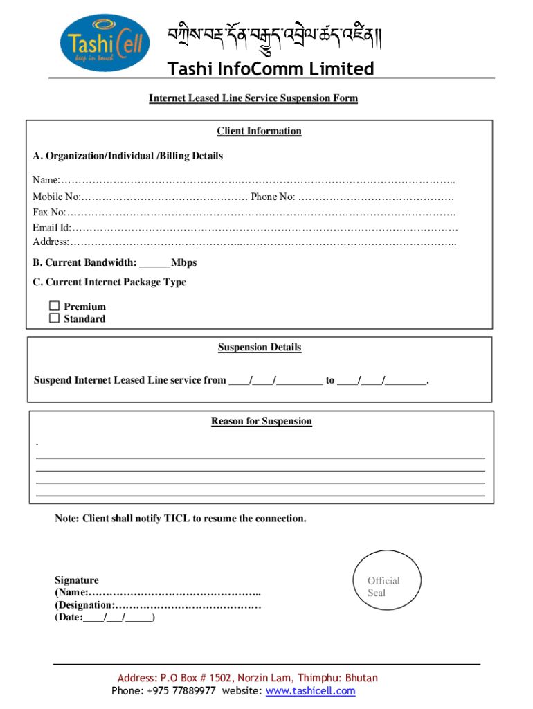 Get the free Internet Leased Line Suspension Form - TashiCell