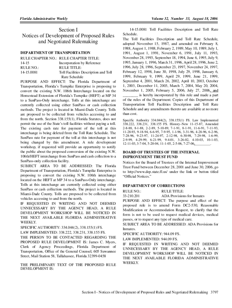 Florida Administrative WeeklyVolume 32, Number 33, August 18, 2006Section I Notice of Development of Proposed Rules and Negotiated Rule making DEPARTMENT OF TRANSPORTATION RULE CHAPTER NO.: RULE CHAPTER