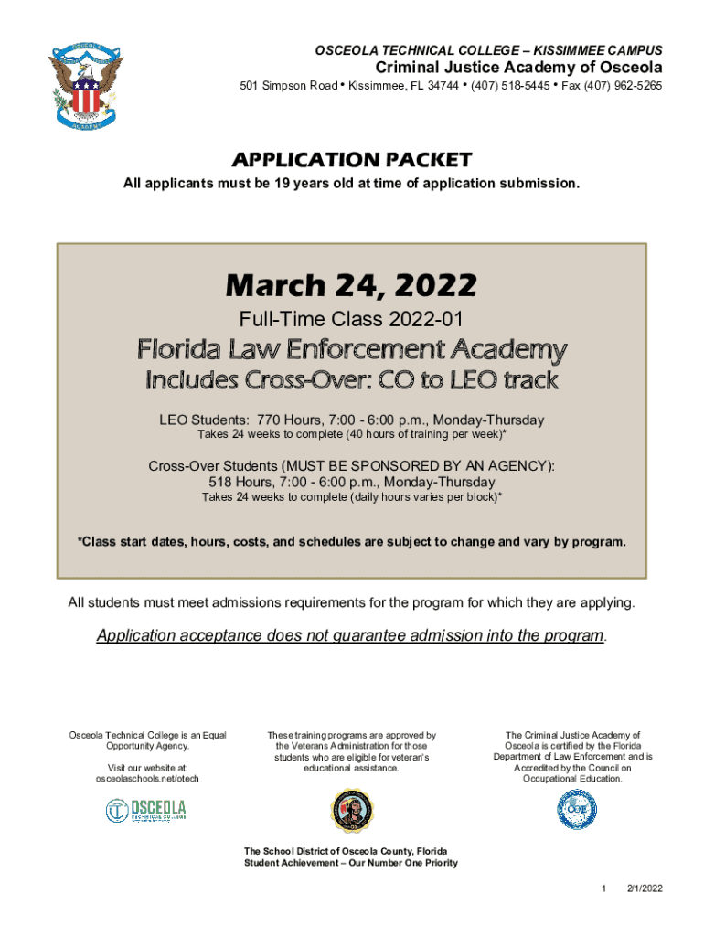 OSCEOLA TECHNICAL COLLEGE KISSIMMEE CAMPUSCriminal Justice Academy of Osceola501 Simpson Road Kissimmee, FL 34744 (407) 5185445 Fax (407) 9625265APPLICATION PACKET All applicants must be 19 years