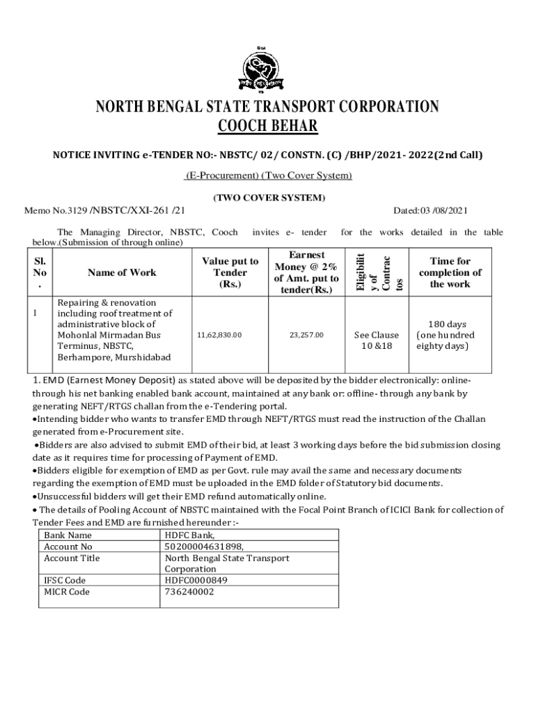 Get the free NOTICE INVITING e-TENDER NO:- NBSTC/ 02/ CONSTN