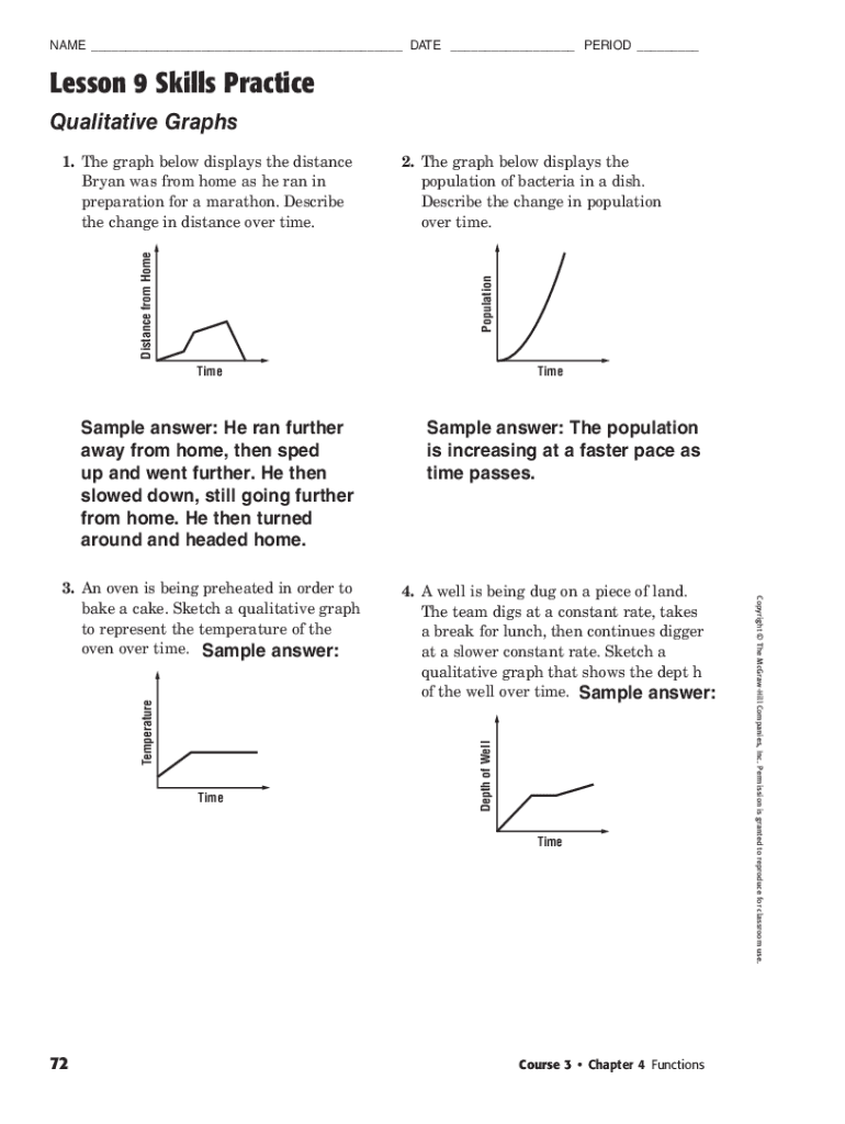 NAME ___ DATE ___ PERIOD ___Lesson 9 Skills Practice Qualitative Graphs 2. The graph below displays the population of bacteria in a dish. Describe the change in population overtime. PopulationDistance