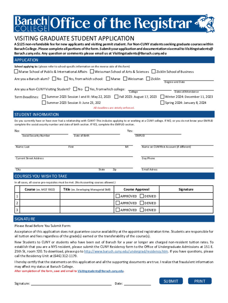 INSTRUCTIONS FOR VISITING GRADUATE STUDENT APPLICATION IMPORTANT INFORMATION Incomplete applications will not be accepted. Baruch College cannot guarantee that requested courses will be available