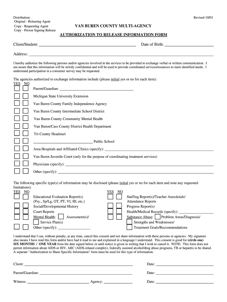 Distribution: Original Releasing Agent Cop — Requesting Agent Copy Person Signing Release Revised 10/03 VAN BUREN COUNTY MULTI-AGENCY AUTHORIZATION TO RELEASE INFORMATION FORM Client/Student: Date