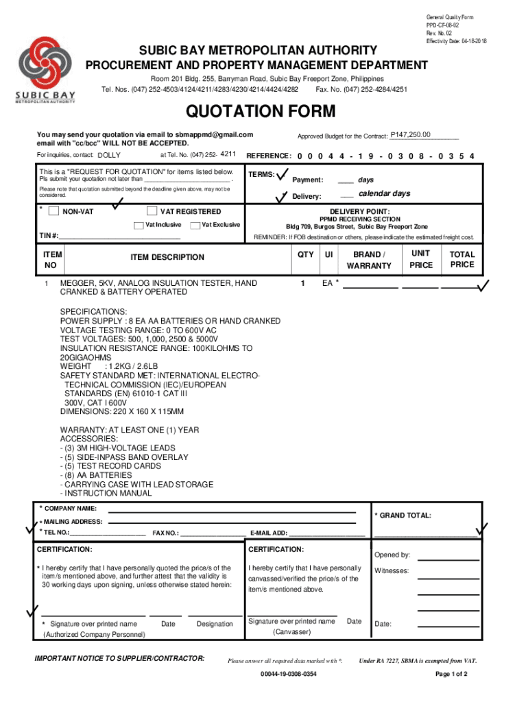 General Quality Form PPDCF0802 Rev. No. 02 Effectivity Date: 04182018SUBIC BAY METROPOLITAN AUTHORITY PROCUREMENT AND PROPERTY MANAGEMENT DEPARTMENT Room 201 Bldg. 255, Barry man Road, Cubic Bay Freeport