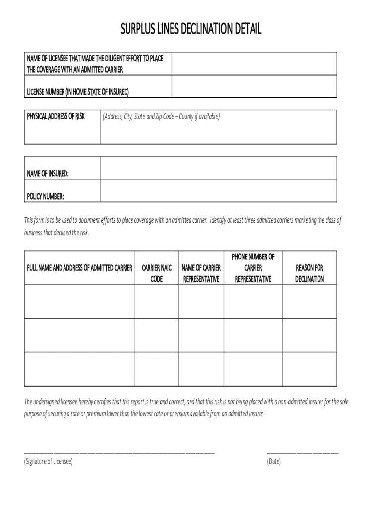 SURPLUS LINES DECLINATION DETAIL NAME OF LICENSEE THAT MADE THE DILIGENT EFFORT TO PLACE THE COVERAGE WITH AN ADMITTED CARRIER LICENSE NUMBER (IN HOME STATE OF INSURED) PHYSICAL ADDRESS OF RISK(Address,