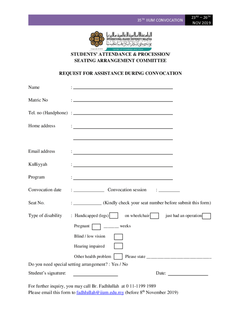 35TH ILIUM CONVOCATION23RD 26TH NOV 2019STUDENTS ATTENDANCE & PROCESSION/ SEATING ARRANGEMENT COMMITTEE REQUEST FOR ASSISTANCE DURING CONVOCATION Name:Matrix No:Tel. No (Hand phone) : Home address:Email