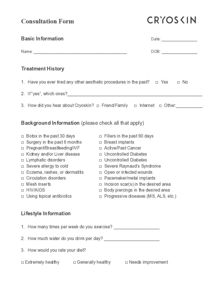 Consultation Form Basic Informational: ___Name: ___DOB: ___Treatment History 1. Have you ever tried any other aesthetic procedures in the past? Yes No2. If yes, which ones?___ 3. How did you hear