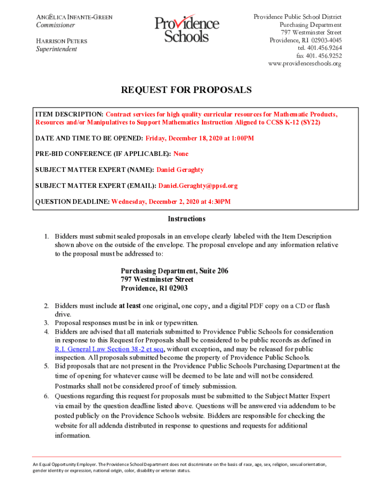 Providence Public School District Purchasing Department 797 Westminster Street Providence, RI 029034045 tel. 401.456.9264 fax 401. 456.9252 www.providenceschools.orgANGLICA INFANTEGREEN Commissioner