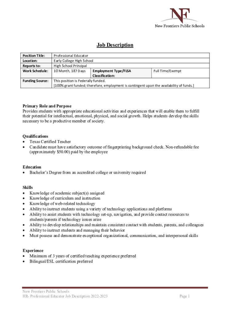 Job Description Position Title: Location: Reports to: Work Schedule: Funding Source:Professional Educator Early College High School Principal 10 Month, 187 Days Employment Type/FLEA Full Time/Exempt