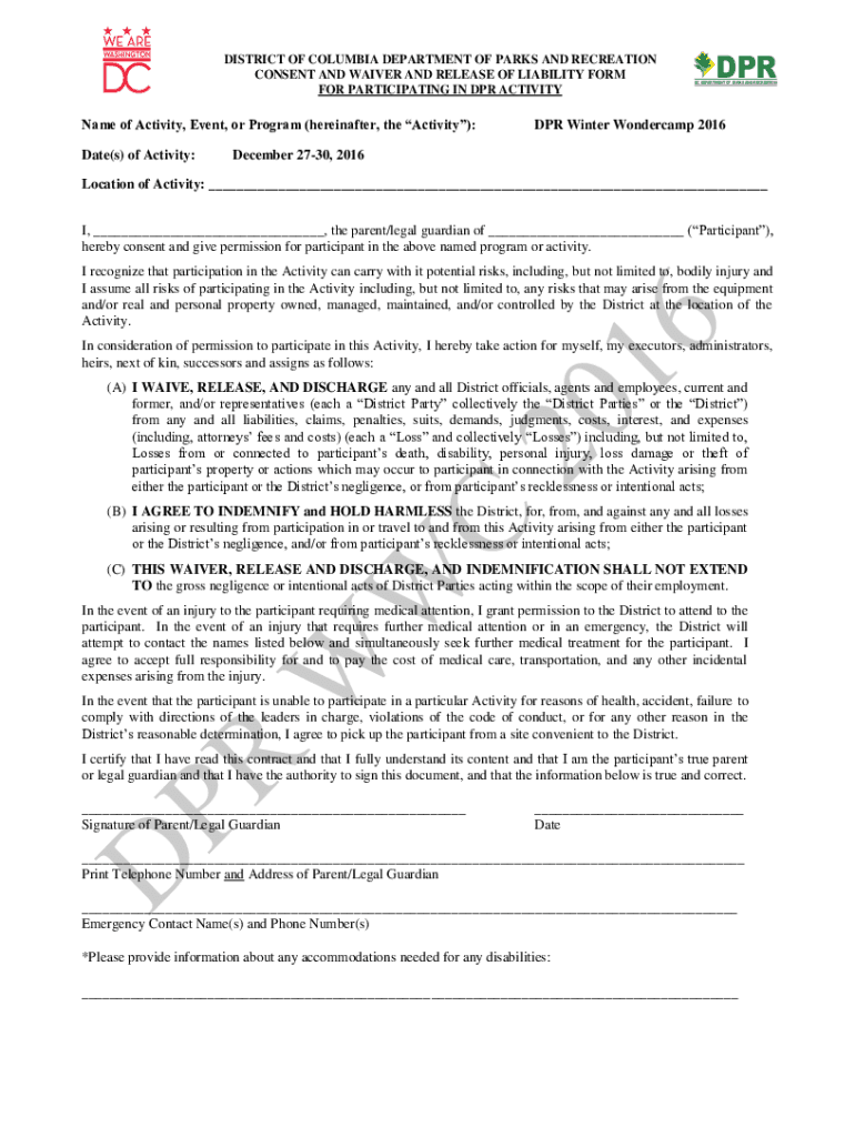 DISTRICT OF COLUMBIA DEPARTMENT OF PARKS AND RECREATION CONSENT AND WAIVER AND RELEASE OF LIABILITY FORM FOR PARTICIPATING IN DR ACTIVITYName of Activity, Event, or Program (hereinafter, the Activity):