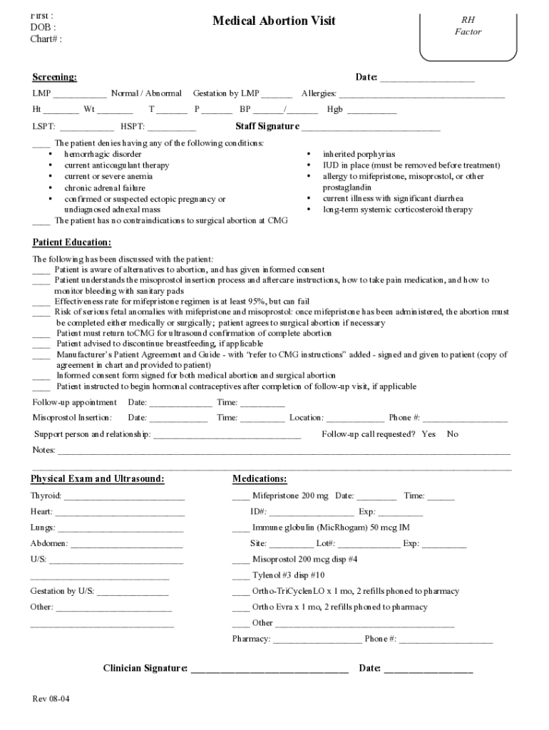 Last : First : DOB : Chart# :Medical Abortion VisitScreening:RH Doctorate: ___LMP ___ Normal / Abnormal Ht ___ Wt ___Gestation by LMP ___Allergies: ___T ___ P ___ BP ___/___LST: ___ HSP: ___Hub ___Staff
