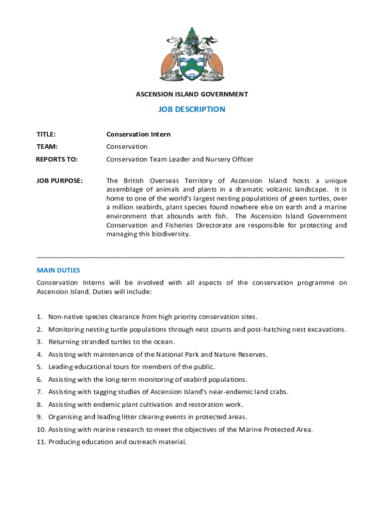 ASCENSION ISLAND GOVERNMENT DESCRIPTION TITLE:Conservation Internal:ConservationREPORTS TO:Conservation Team Leader and Nursery Officer PURPOSE:The British Overseas Territory of Ascension Island hosts