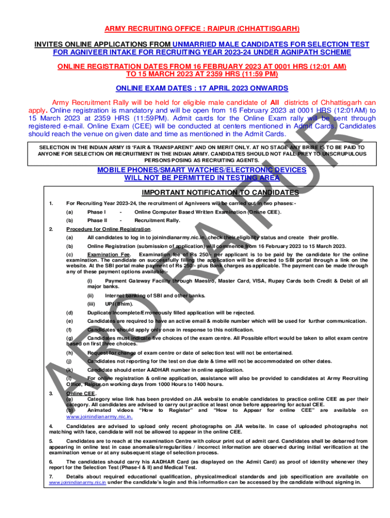 ARMY RECRUITING OFFICE : RAIPUR (CHHATTISGARH) INVITES ONLINE APPLICATIONS FROM UNMARRIED MALE CANDIDATES FOR SELECTION TEST FOR GIVER INTAKE FOR RECRUITING YEAR 202324 UNDER ANIMATE SCHEME ONLINE