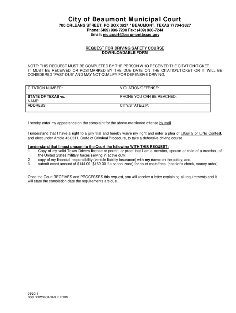 City of Beaumont Municipal Court 700 ORLEANS STREET, PO BOX 3827 * BEAUMONT, TEXAS 777043827 Phone: (409) 9807200 Fax: (409) 9807244 Email: mc.court@beaumonttexas.gov REQUEST FOR DRIVING SAFETY COURSE