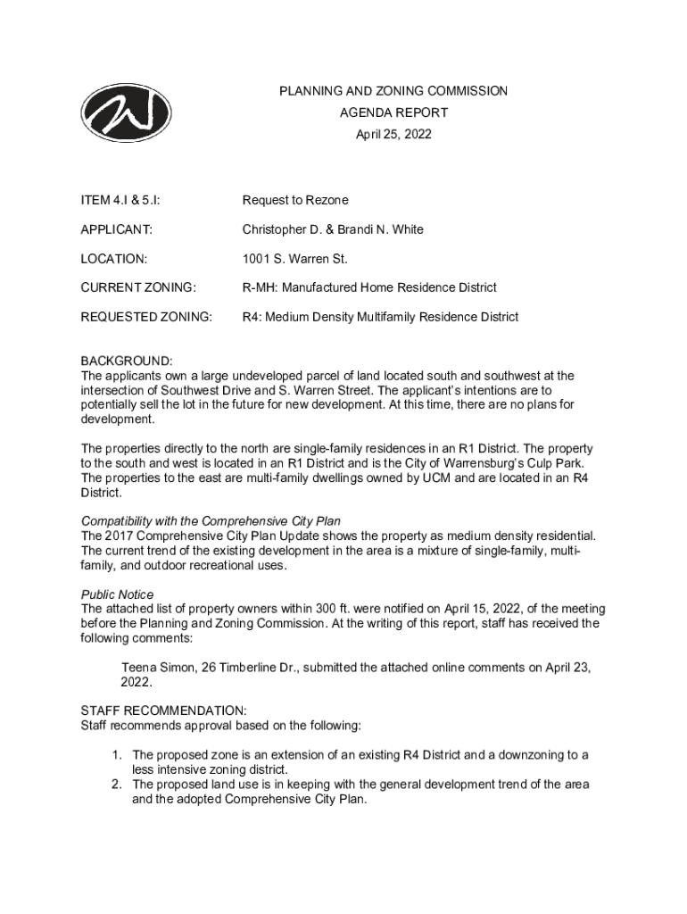 PLANNING AND ZONING COMMISSION AGENDA REPORT April 25, 2022ITEM 4. I & 5. I:Request to RezoneAPPLICANT:Christopher D. & Brandi N. WhiteLOCATION:1001 S. Warren St. CURRENT ZONING:RMS: Manufactured
