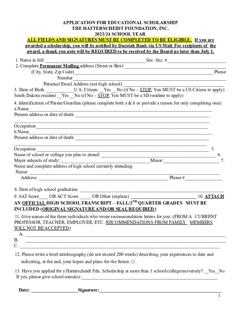 APPLICATION FOR EDUCATIONAL SCHOLARSHIP THE HATTERSCHEIDT FOUNDATION, INC. 2023/24 SCHOOL YEAR ALL FIELDS AND SIGNATURES MUST BE COMPLETED TO BE ELIGIBLE. If you are awarded a scholarship, you will