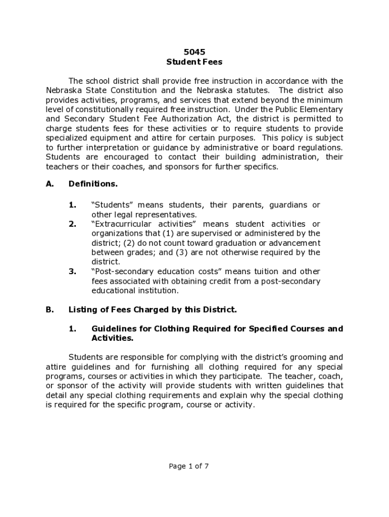 5045 Student Fees The school district shall provide free instruction in accordance with the Nebraska State Constitution and the Nebraska statutes. The district also provides activities, programs,