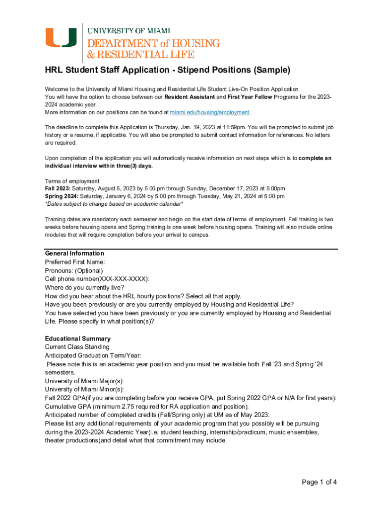 NRL Student Staff Application Stipend Positions (Sample) Welcome to the University of Miami Housing and Residential Life Student Liven Position Application You will have the option to choose between