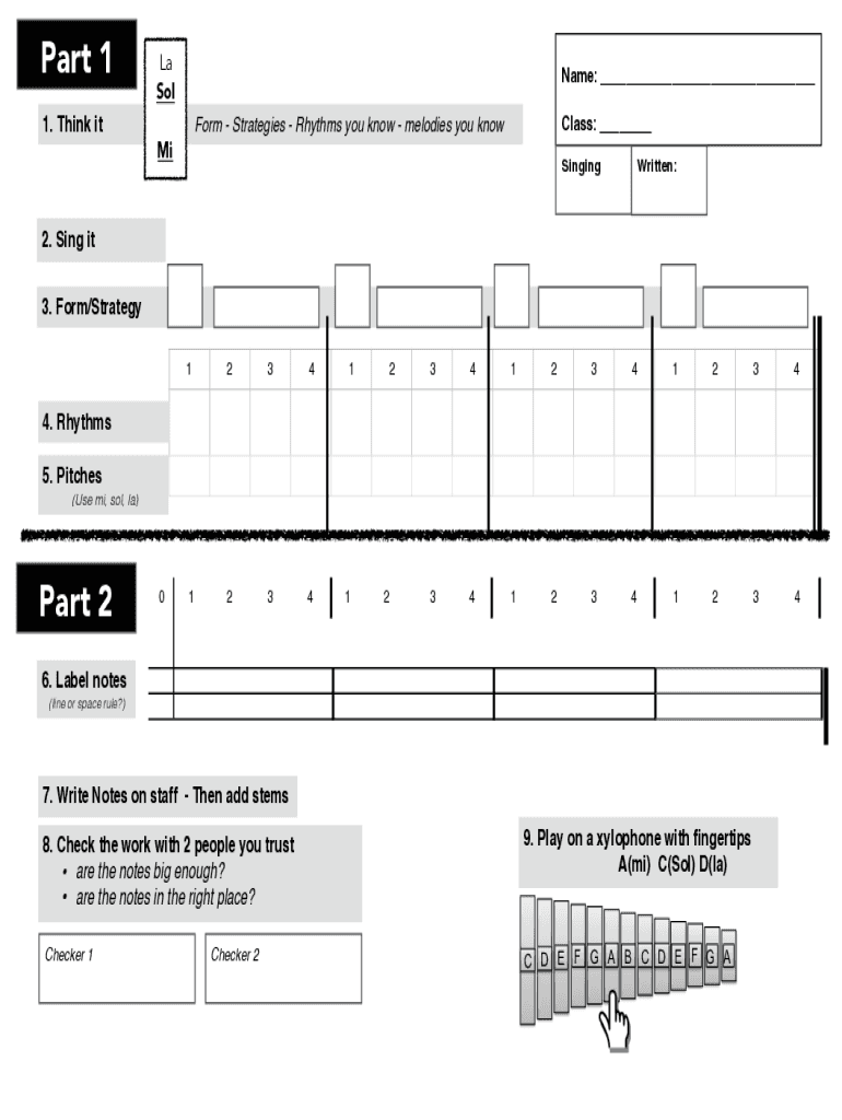 Part 1 1. Think ETLA Surname: ___ Class: ___Form Strategies Rhythms you know melodies you knowMiSingingWritten:2. Sing it 3. Form/Strategy 1234123412341234123434123412344. Rhythms 5. Pitches (Use