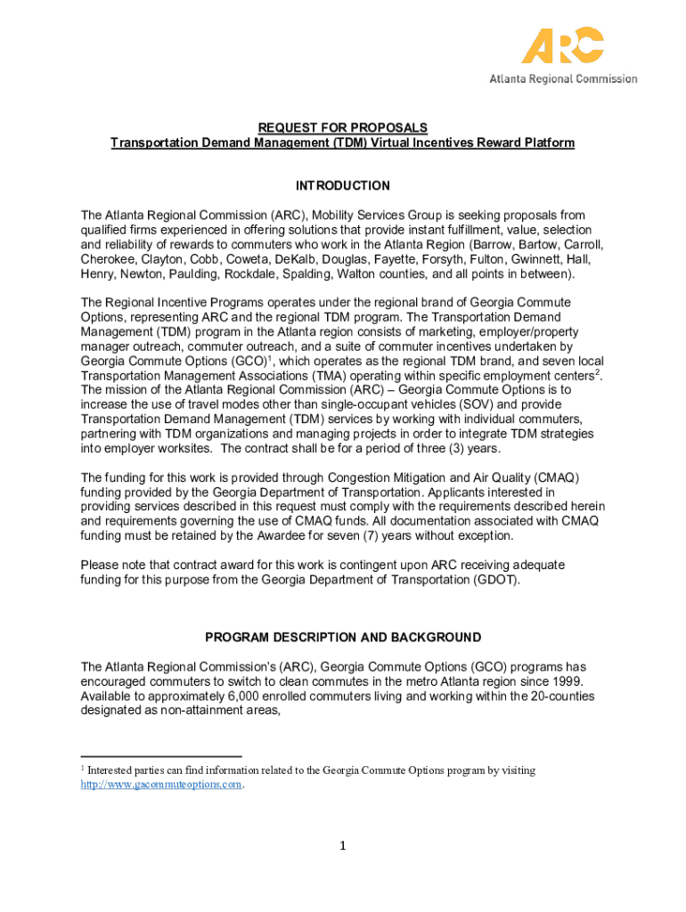 REQUEST FOR PROPOSALS Transportation Demand Management (TDM) Virtual Incentives Reward Platform INTRODUCTION The Atlanta Regional Commission (ARC), Mobility Services Group is seeking proposals from