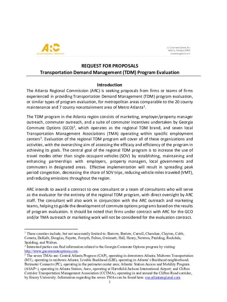 REQUEST FOR PROPOSALS Transportation Demand Management (TDM) Program Evaluation Introduction Atlanta Regional Commission (ARC) is seeking proposals from firms or teams of firms experienced in providing