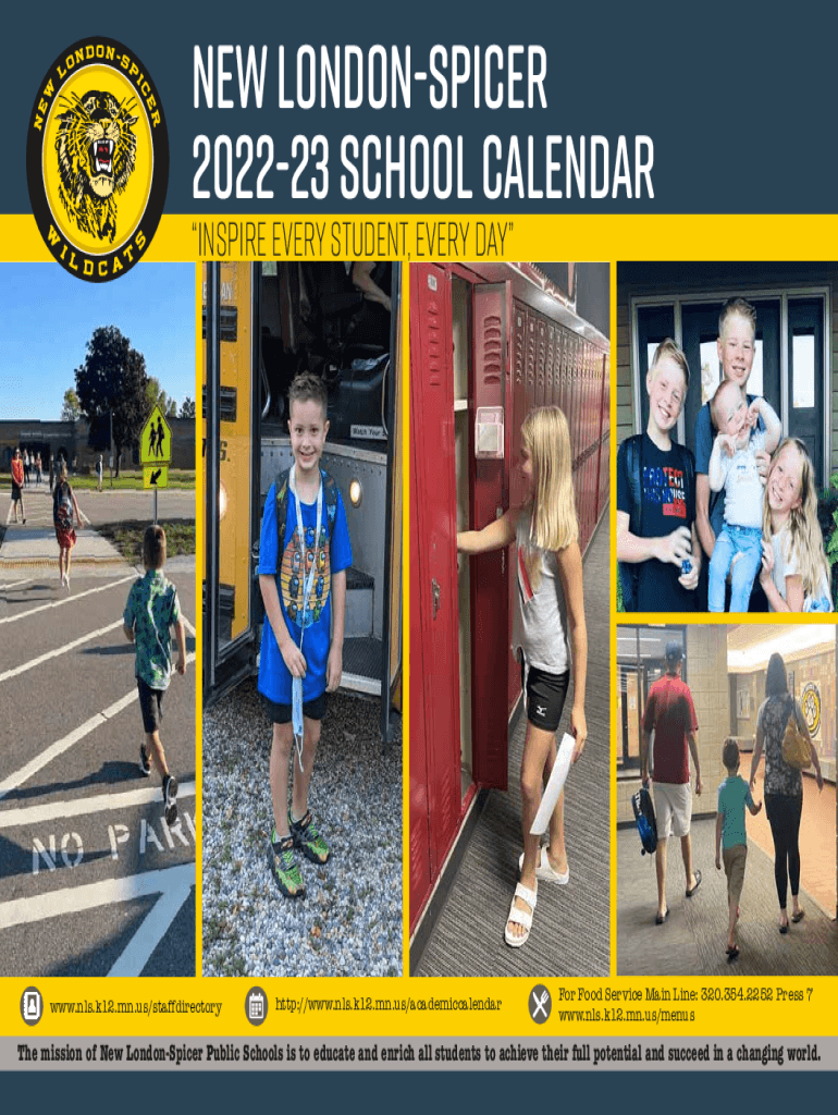 New London Spicer 202223 School Calendar inspire every student, every day.NLS.k12.mn.us/staffdirectoryhttp://www.nls.k12.mn.us/academiccalendarFor Food Service Main Line: 320.354.2252 Press 7 www.nls.k12.mn.us/menusThe