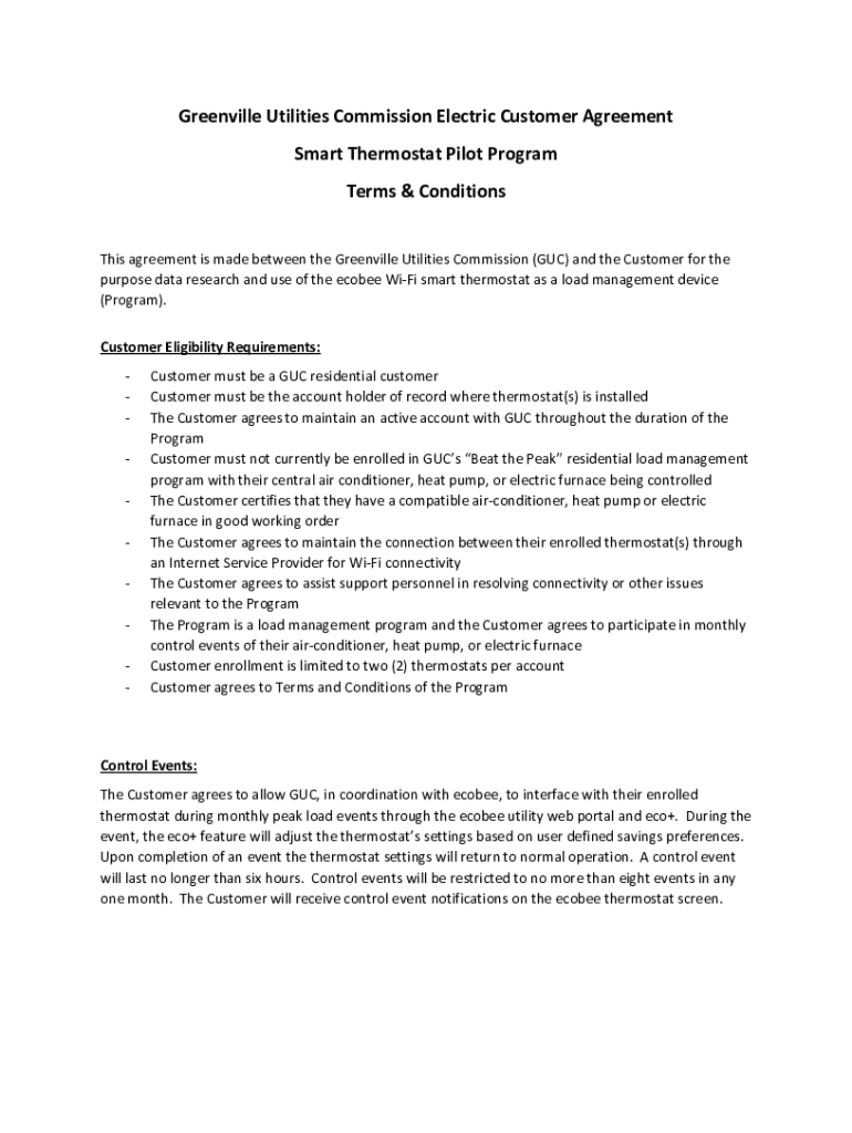 Greenville Utilities Commission Electric Customer Agreement Smart Thermostat Pilot Program Terms & Conditions This agreement is made between the Greenville Utilities Commission (GUC) and the Customer