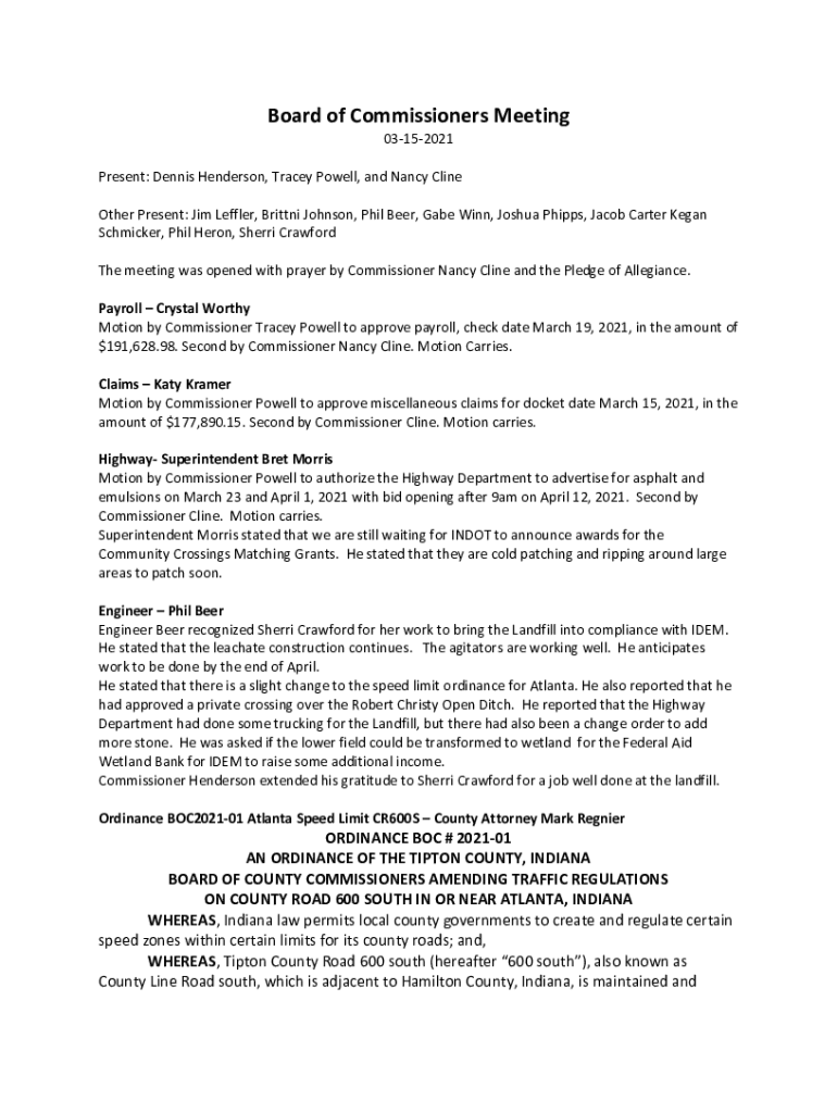 Board of Commissioners Meeting 03152021 Present: Dennis Henderson, Tracey Powell, and Nancy Cline Other Present: Jim Loeffler, Britain Johnson, Phil Beer, Gabe Win, Joshua Phipps, Jacob Carter Began