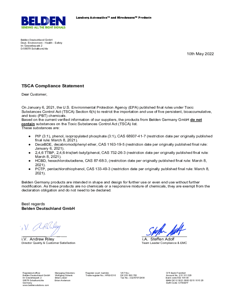 D58579 Schalksmhle10th May 2022TSCA Compliance Statement