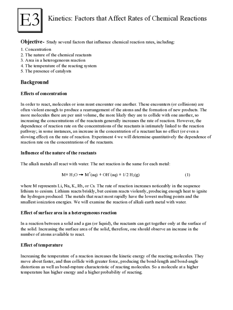 E3Kinetics: Factors that Affect Rates of Chemical ReactionsObjective Study several factors that influence chemical reaction rates, including: 1. Concentration 2. The nature of the chemical reactants