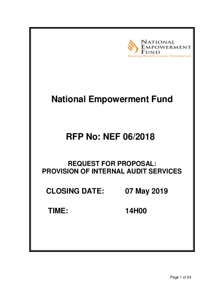 National Empowerment Fund RFP No: NEW 06/2018 REQUEST FOR PROPOSAL: PROVISION OF INTERNAL AUDIT SERVICESCLOSING DATE:07 May 2019TIME:14H00Page 1 of 241. Proprietary Information: The National Empowerment