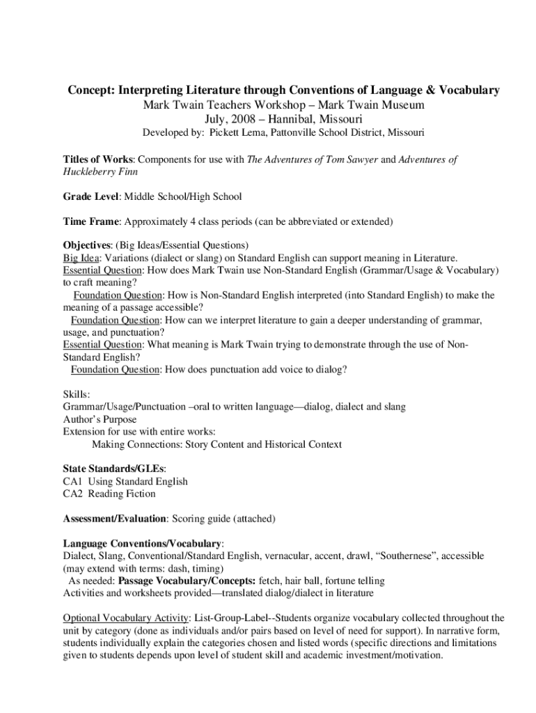 Concept: Interpreting Literature through Conventions of Language & Vocabulary Mark Twain Teachers Workshop Mark Twain Museum July 2008 Hannibal, Missouri Developed by: Pickett Lima, Watsonville School