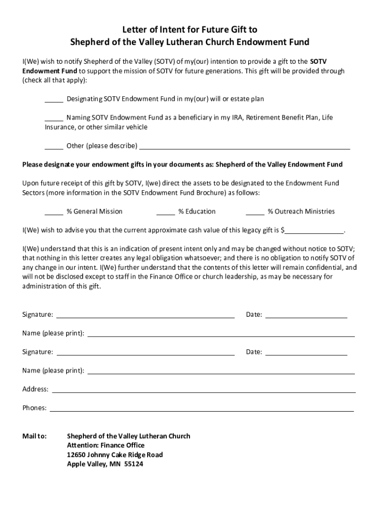 Letter of Intent for Future Gift to Shepherd of the Valley Lutheran Church Endowment Fund I(We) wish to notify Shepherd of the Valley (SOTO) of my(our) intention to provide a gift to the SOTO Endowment