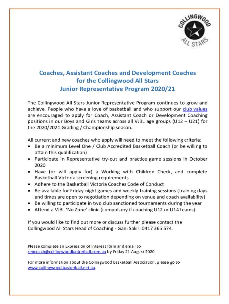 Coaches, Assistant Coaches and Development Coaches for the Collingwood All Stars Junior Representative Program 2020/21 The Collingwood All Stars Junior Representative Program continues to grow and