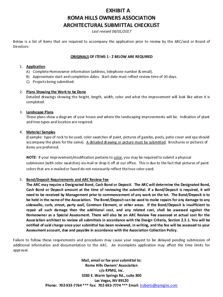 EXHIBIT A ROMA HILLS OWNERS ASSOCIATION ARCHITECTURAL SUBMITTAL CHECKLIST Last revised 06/01/2017 Below is a list of items that are required to accompany the application prior to review by the ARC/and