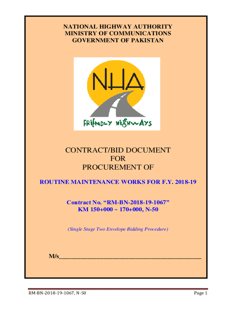 NATIONAL HIGHWAY AUTHORITY MINISTRY OF COMMUNICATIONS GOVERNMENT OF PAKISTANCONTRACT/BID DOCUMENT FOR PROCUREMENT OF ROUTINE MAINTENANCE WORKS FOR F.Y. 201819 Contract No. RMBN2018191067 KM 150+000
