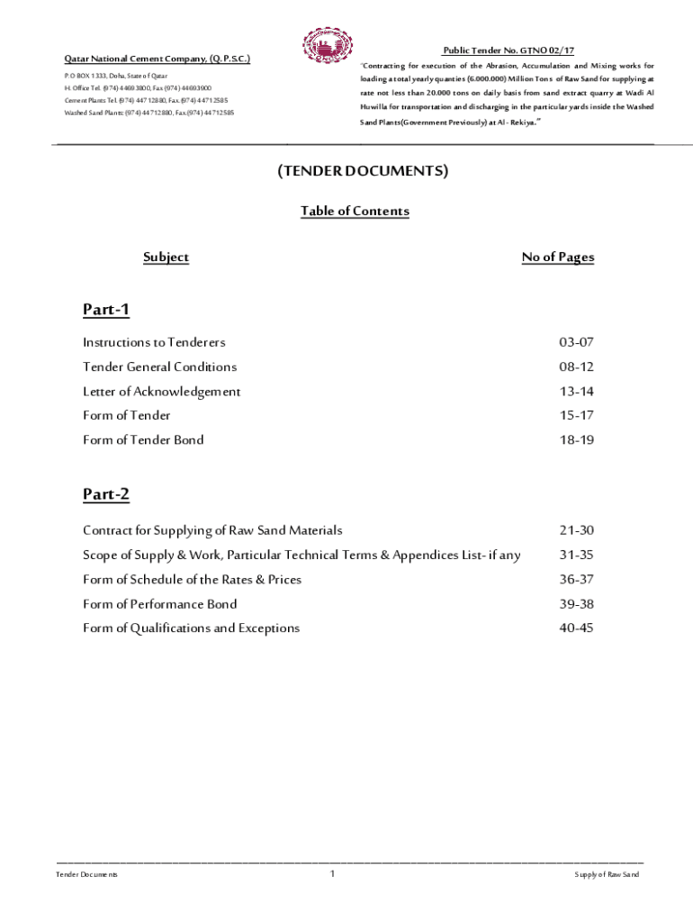 Public Tender No. GINO 02/17Qatar National Cement Company, (Q.P.S.C.) Contracting for execution of the Abrasion, Accumulation and Mixing works for. O BOX 1333, Doha, State of Qatar H. Office Tel.