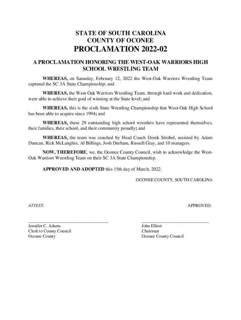 STATE OF SOUTH CAROLINA COUNTY OF OCONEEPROCLAMATION 202202 A PROCLAMATION HONORING THE WESTON WARRIORS HIGH SCHOOL WRESTLING TEAM WHEREAS, on Saturday, February 12, 2022, the Weston Warriors Wrestling