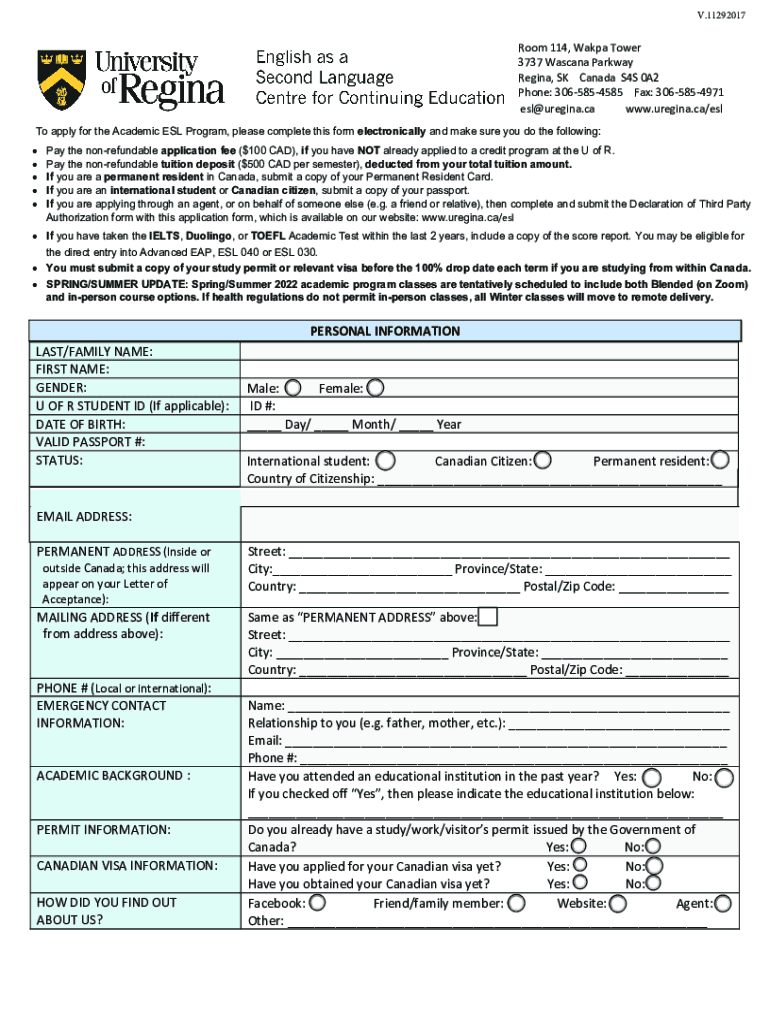 The Severest Form.11292017Print Workroom 114, Aka Tower 3737 Mascara Parkway Regina, SK Canada S4S 0A2 Phone: 3065854585 Fax: 3065854971 esl@uregina.ca www.uregina.ca/esl To apply for the Academic