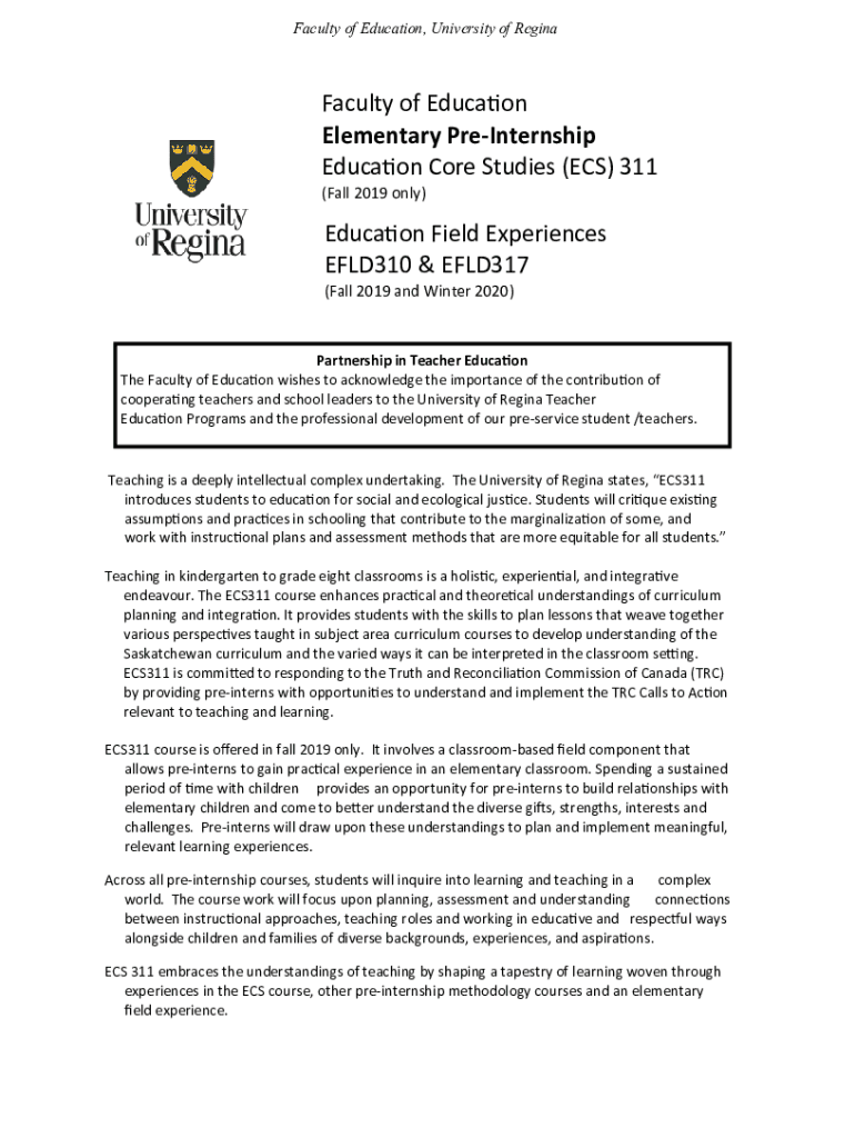 Faculty of Education, University of ReginaFaculty of Education Elementary Internship Education Core Studies (ECS) 311 (Fall 2019 only)Education Field Experiences EFLD310 & EFLD317 (Fall 2019 and Winter